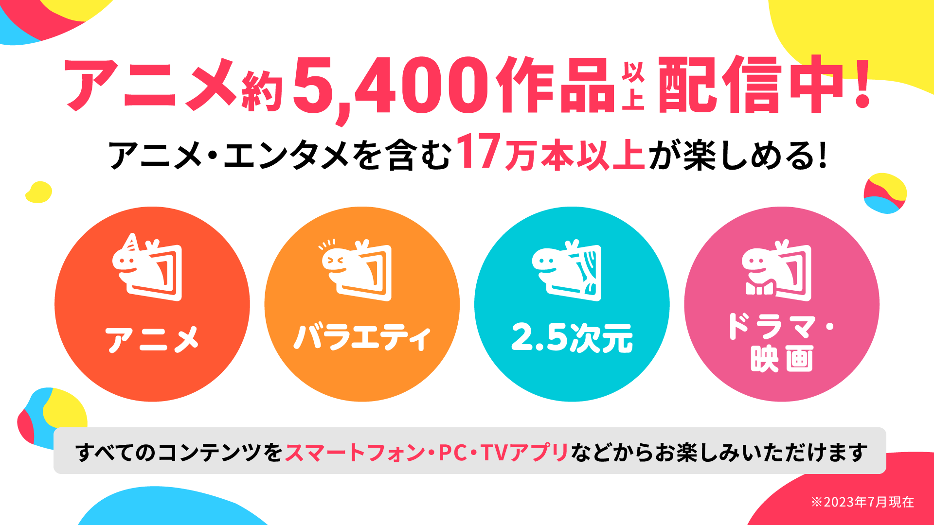 新作から独占配信作品、そしてオリジナル作品まで、アニメ約5,400作品以上、エンタメを含む17万本以上※のコンテンツをスマートフォン・PC・TVアプリなどからお楽しみいただけます。